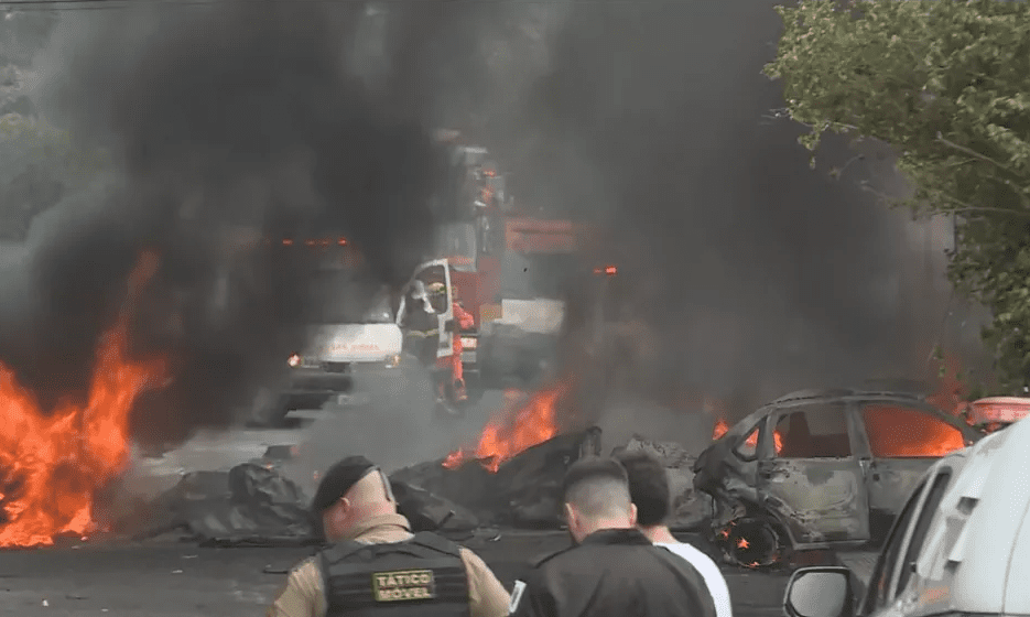 O acidente aconteceu próximo a uma academia. Foram ouvidas pelo menos duas explosões. O local está isolado. Moradores da região relataram a explosão e disseram que tentaram apagar as chamas.