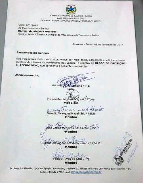 A bancada de oposição na Casa Aprígio Duarte Filho terá uma nova configuração para o novo período legislativo. O bloco opositor ‘Juazeiro Vivo’, formado pelos vereadores Roninho (PTB), Nalvinho (PTdoB) – líder e vice, respectivamente –, Zé Carlos Medeiros (PV), Neguinha da Santa Casa (PV), Bené Marques (PSDB) e Suzana Ramos (PTdoB) configuram a atual bancada. O documento foi oficializado na última semana junto à Mesa Diretora da Casa.