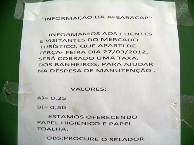 Não que seja novidade a tarifa para o uso de banheiros em locais como o mercado. Em outras cidades isso também ocorre. A questão é taxa diferenciada para se fazer as necessidades fisiológicas: Quem for urinar, terá de pagar R$ 0,25. Já para quem for eliminar outros excrementos,o valor é R$ 0,50.