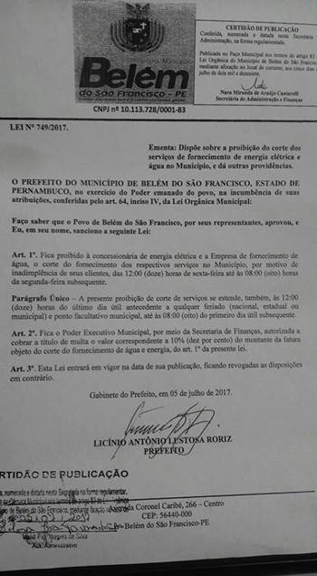 Em Belém do São Francisco (PE), Sertão de Itaparica, o prefeito Licínio Lustosa sancionou uma lei municipal proibindo o corte de água e energia aos finais de semana por inadimplência dos seus clientes.
