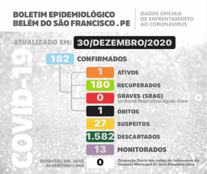 A Secretaria de Saúde de Belém do São Francisco (PE), Sertão de Itaparica, registrou o primeiro óbito em decorrência do novo Coronavírus (Covid-19), ao longo dos últimos 9 meses, em seu boletim desta quarta-feira (30). Trata-se de uma idosa de 85 anos, residente no município. Contudo, a paciente encontrava-se há 4 meses em Petrolina, onde ocorreram os fatos.