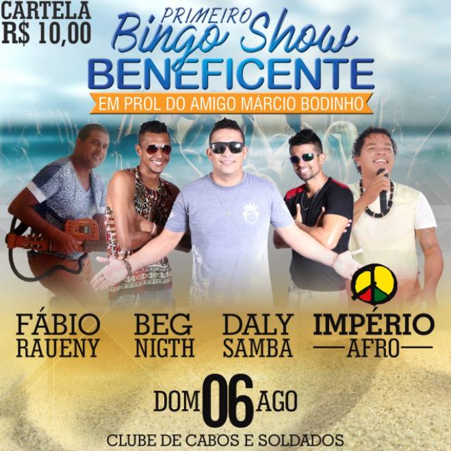 Vários artistas de Juazeiro (BA) estão organizando um bingo show beneficente em prol do tratamento de saúde do músico Márcio ‘Bodinho’, bastante conhecido na cena cultural da cidade. O evento acontecerá neste domingo (6), no Clube de Cabos e Soldados, próximo à Câmara de Vereadores, na Malhada da Areia, a partir das 13h.