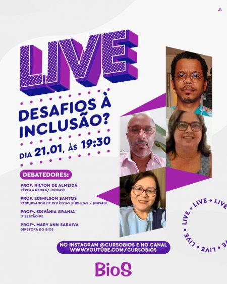 O Bios, preparatório para vestibulares e concursos, irá promover um debate online nesta quinta-feira (21), às 19h30, sobre atitudes que geram a inclusão de jovens em vulnerabilidade. A live é aberta ao público e vai acontecer simultaneamente na página do Instagram @cursobios e no YouTube “cursobios”.