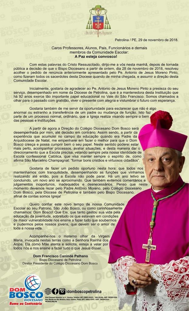 O bispo da Diocese de Petrolina, Dom Francisco Canindé Palhano, emitiu uma carta discurso sobre a nova direção do Colégio Dom Bosco. Segundo Dom Francisco, “isso faz parte de um processo normal, ordinário, que a igreja realiza visando sempre o bem das pessoas e instituições”.