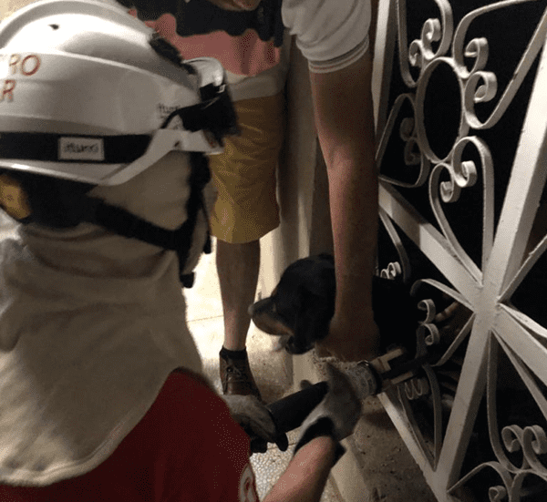 Segundo informações do 9º GBM, o animal corria risco de morrer, uma vez que, ao tentar se livrar desesperadamente daquela situação, ele estava sendo perfurado pelos arames da grade. Utilizando equipamentos adequados, os bombeiros cerraram a grade e livraram o cão.