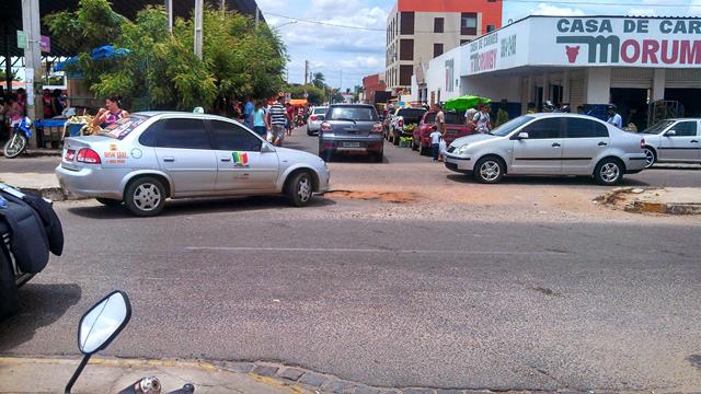 Um buraco de proporções razoáveis se formou no cruzamento próximo à feira, o que obriga os condutores a redobrarem a atenção. Além de se preocuparem com o trânsito, eles também precisam desviar do buraco, o que nem sempre é possível.