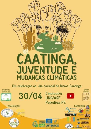 Para discutir sobre a caatinga e as mudanças climáticas, a Rede Jovem da Reserva da Biosfera da Caatinga (RBCA), por meio do Conselho Nacional da Reserva da Biosfera da Caatinga, do Programa Homem e Biosfera da Unesco, irá realizar um evento em comemoração ao dia nacional do bioma no próximo dia 30 de abril. O objetivo é apresentar aos jovens  as potencialidades do bioma tipicamente brasileiro e o papel da juventude frente às mudanças climáticas no Semiárido Nordestino e sua importância para o desenvolvimento sustentável.