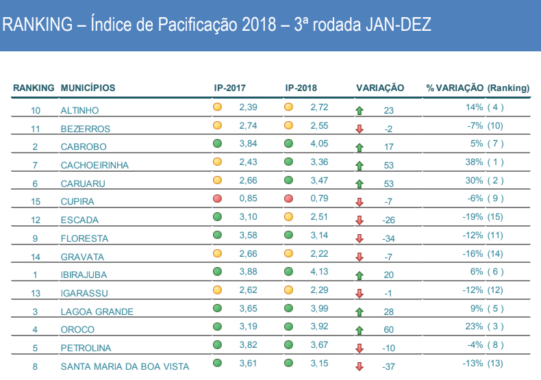 O Índice de Pacificação é representado numa escala de 0 a 5, onde 0 indica um município menos pacificado. Quanto mais próximo de 5, maior o nível de pacificação do município. O indicador é calculado a partir de uma média ponderada entre os CVLIs (Crimes Violentos Letais e Intencionais) e os CVPs (Crimes Violentos contra o Patrimônio), a qual foram atribuídos os pesos de 80% e 20%, respectivamente. O índice possibilita gerar o ranking dos municípios com maior nível de pacificação. Também é possível comparar o desempenho dos municípios entre períodos diferentes e avaliar o quanto mudou de um período para o outro. Esse percentual de variação do índice de pacificação possibilita destacar o esforço de cada município em mudar o cenário da criminalidade. O ranking com as quinze cidades mais pacificadas de Pernambuco pode ser conferido abaixo: