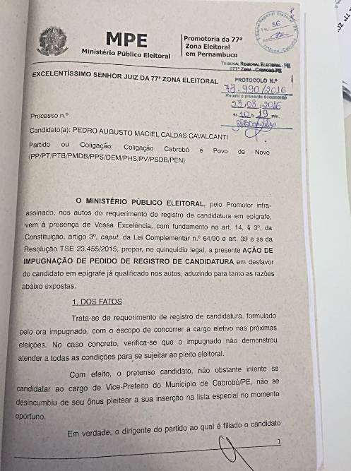 Na ação (veja aqui), o promotor Carlos Eugênio de Rego Barros Quintas Lopes diz que Pedro não cumpriu o prazo estabelecido pela legislação eleitoral para filiação partidária.