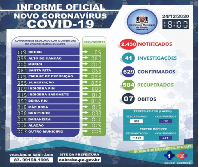 Com essa atualização, Cabrobó contabiliza 629 casos positivos da doença, além de 504 recuperados e sete óbitos. Casos em investigação somam 41 no município.