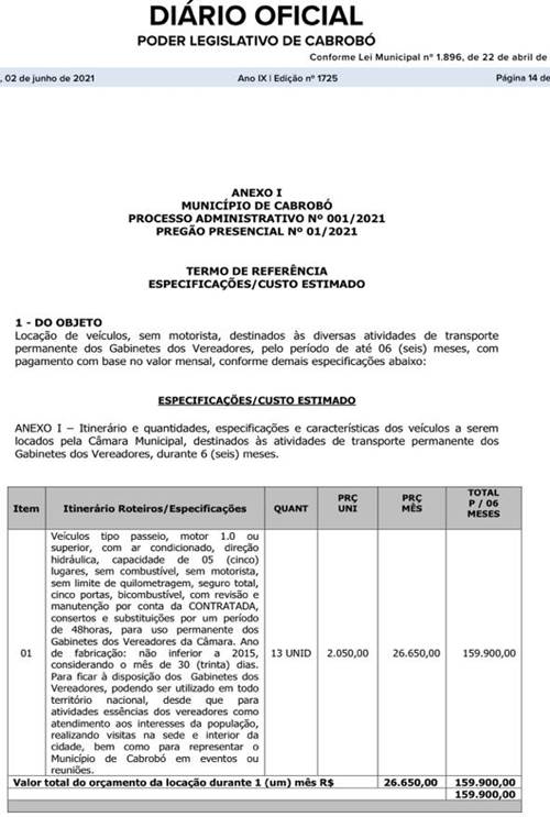 Pelo contrato, o pagamento mensal pela locação dos veículos é de R$ 26.650,00, o que daria ao todo R$ 159.900,00 – se forem cumpridos os seis meses. A decisão pode até ser legítima, mas à boca pequena os comentários de bastidores na cidade são de que, numa crise sanitária tão grave pela qual o país e o mundo atravessam, a casa legislativa de Cabrobó poderia passar sem esse gasto.