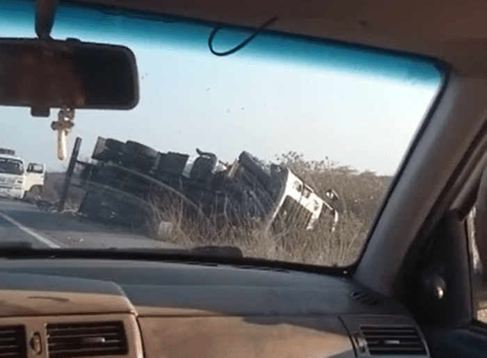 A informação é de que ninguém ficou ferido. O veículo tombou ao lado da pista e a carga não ficou espalhada pela estrada, por isso o trânsito não ficou congestionado. Não há informações sobre o que teria motivado o acidente.