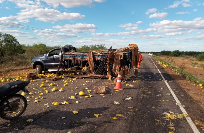Um caminhão tombou na tarde desta quinta-feira (16) na BA-210, entre Juazeiro e Curaçá, no norte da Bahia. O veículo transportava melão, quando tombou na pista. A carga ficou totalmente espalhada pela rodovia, que teve de ser interditada.