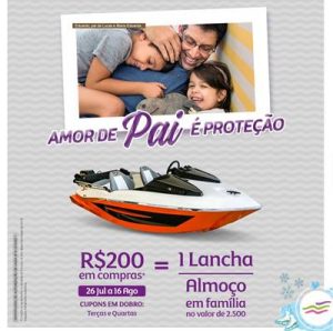 O primeiro sorteio – o almoço em família – será no dia 7 de agosto. Como prêmio principal, será sorteada a lancha no dia 16 seguinte. Para concorrer aos prêmios, o cliente deverá apresentar até quatro notas fiscais que, juntas, somem R$ 200,00 em compras nas lojas participantes.