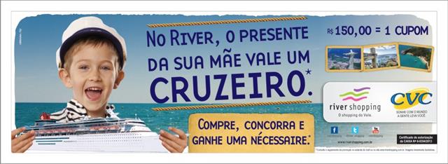 Continua a pleno vapor uma campanha promovida pelo River Shopping, em parceria com a agência de viagens CVC, que irá sortear no Dia das Mães um cruzeiro de oito dias, com direito a acompanhante, pela costa brasileira. Para participar da promoção, iniciada semana passada, os consumidores devem trocar R$ 150 em notas fiscais de compras realizadas em lojas e quiosques do River por um cupom.