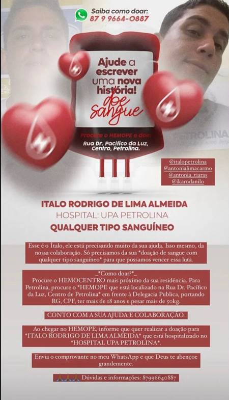 Familiares e amigos do petrolinense Ítalo Rodrigo de Lima Almeida, de 32 anos, estão se mobilizando para conseguir o maior número de doações de sangue possível, após o jovem ser diagnosticado com uma anemia profunda (para saber os detalhes de como ajudar ítalo, é só conferir abaixo).