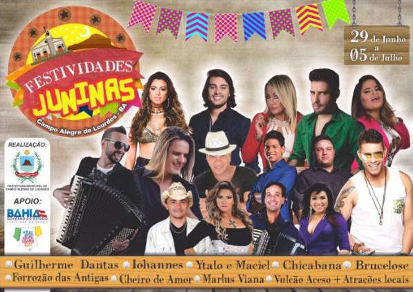 O município de Campo Alegre de Lourdes, no norte da Bahia, divulgou a programação dos festejos juninos e do aniversário da cidade. Com o slogan “O São João da Bahia termina aqui!”, serão sete dias de festas que se iniciarão no dia 29 de junho, com abertura no Bairro Pedro Alcântara.