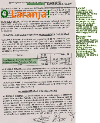 O fato mais polêmico do momento se deu a partir de um recente debate promovido pela Câmara de Vereadores. Alvinho, que é advogado, vereador, dono de uma rádio comunitária e outras empresas, chegou a falar de seu patrimônio e citou que seria proprietário do Posto Brasil Ltda, no ramo do comércio varejista de combustível para veículos automotores. Mas corre no Facebook uma nota identificada por ‘O Laranja’, mostrando o contrato social do posto.