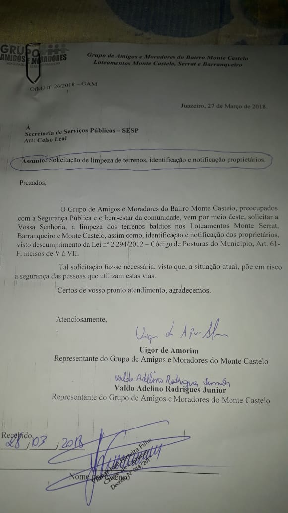 A Associação de Amigos e Moradores do Loteamento Monte Castelo, em Juazeiro (BA), procurou este Blog para relatar que os moradores da Rua Itaigara estão tirando dinheiro do próprio bolso para limpar um terreno baldio.