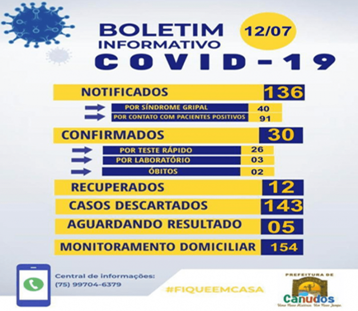 A gestão municipal explica ainda que “o descumprimento das determinações contidas no decreto implicará em punições, estando a Polícia Militar autorizada a atuar no município promovendo meios de repressão adequados para se fazer cumprir as determinações”. Com essa atualização, Canudos totaliza 30 casos positivos da Covid-19, além 12 recuperados e dois óbitos. Um total de 143 casos da doença foi descartado.