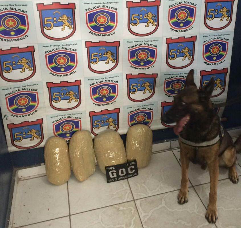 Um cão farejador do 5º Batalhão de Polícia Militar (BPM) localizou, na tarde de hoje (14), quase 5 quilos de maconha que estava sendo transportada por um adolescente de 17 anos. O caso aconteceu próximo ao N-10 do Perímetro de Irrigação Senador Nilo Coelho, zona rural de Petrolina.
