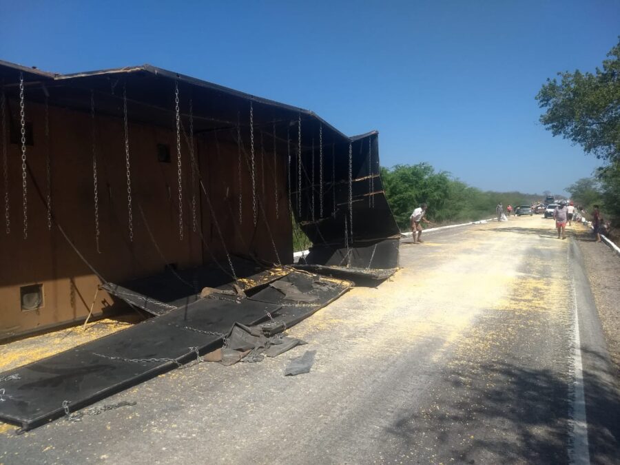 Uma carreta carregada de milho tombou na BR-316, entre os municípios de Floresta (PE) e Petrolândia (PE), Sertão de Itaparica, na manhã de ontem (22). Informações dão conta que o motorista tentou desviar de um animal solto na pista e acabou perdendo o controle da carreta próximo ao canal de transposição do São Francisco.