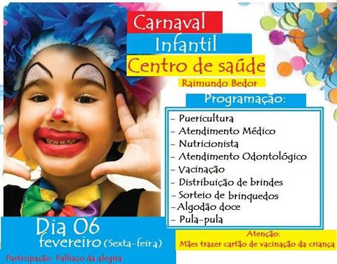 Segundo a Secretaria Municipal de Saúde, o carnaval infantil acontecerá no dia 6 de fevereiro, a partir das 8h, no Centro de Saúde.