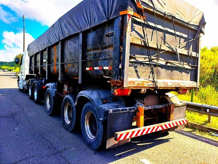 O veículo foi recolhido ao pátio conveniado e somente será liberado após o transbordo da carga a mais para outra carreta, além de regularizar as outras pendências.