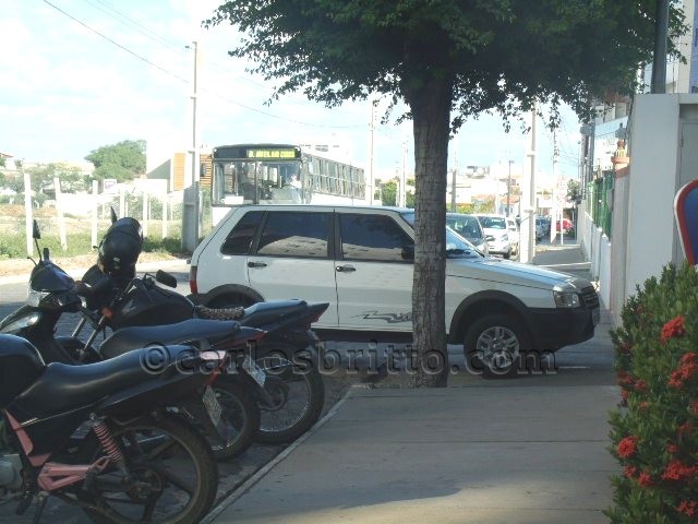 No Centro da cidade, em frente ao River Shopping, quem precisou seguir pela calçada teve apenas duas opções: arriscar-se no meio da rua ou tentar se espremer para passar pelo pequeno espaço que sobrou entre o veículo e a parede. Lembrando que estacionar em calçada é infração grave que prevê multa de R$ 127,69 e cinco pontos na carteira.
