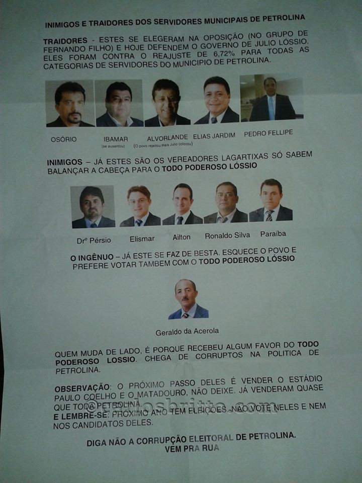 Se referindo a Petrolina cartaz melhor não podia ter, pois é a mais pura verdade esses ai são todos traidores e covardes que vivem recebendo dinheiro de Lóssio para votar nos projetos dele.