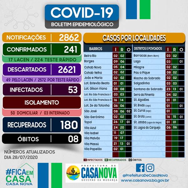 Ainda há 53 infectados e, destes, 3 internados e 50 em isolamento domiciliar, que de acordo com o secretário estão com quadro estável, mas exigem cuidados. Até agora os óbitos por Covid-19 em Casa Nova somam 8.