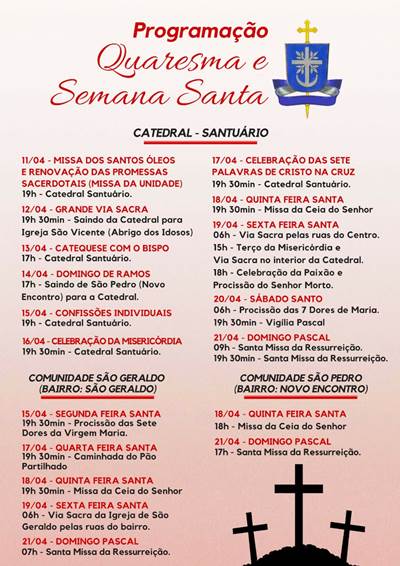 Durante a semana haverá Missa de Lava-pés na quinta-feira (18) e na sexta (19). Já a celebração da Paixão do Senhor e via-sacra, no sábado (20), acontecerá a Vigília Pascal às 19h30, finalizando no domingo (21) com a Missa de Páscoa.