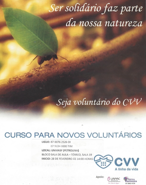 O Centro de Valorização da Vida (CVV) de Petrolina está com inscrições abertas para um curso de novos voluntários. A capacitação é gratuita e será realizada no dia 28 de fevereiro, às 14h, na Universidade Federal do Vale do São Francisco (Univasf), em Petrolina.