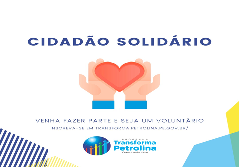 O Transforma Petrolina iniciou uma campanha de convocação de voluntários de diversas áreas para ajudar pessoas que estão precisando e, principalmente, para exercitar a solidariedade, que pode vir desde a doação de máscaras até uma ligação com uma palavra de incentivo. A ação, chamada de Cidadão Solidário visa a amenizar os impactos sociais provocados pelo novo coronavírus (Covid-19) e estimular na população a esperança e o engajamento voluntário.
