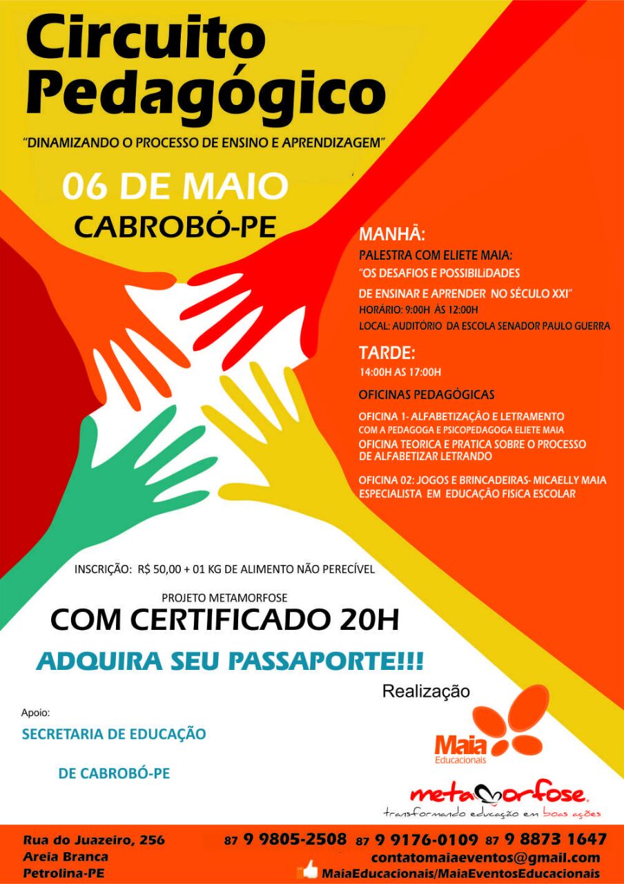 Cabrobó, no Sertão do São Francisco, está entre as cidades pernambucanas que mais obtiveram resultados positivos no Índice de Desenvolvimento da Educação de Pernambuco (Idepe), nos últimos anos. Para avançar nesse sentido um projeto – intitulado ‘Metamorfose’ – vai levar à cidade o circuito de oficinas pedagógicas ‘Dinamizando o Processo de Ensino e Aprendizagem. A iniciativa acontece em parceria entre a Maia Eventos Educacionais e a Secretaria Municipal de Educação, no próximo dia 6 de maio, a partir das 9h no auditório da Escola Senador Paulo Guerra, Centro da cidade.