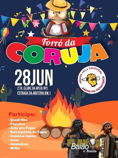 O clima junino vai tomar conta da APLB/Sindicato de Juazeiro (BA) nesta sexta-feira (28), com o “Forró da Coruja”. O evento faz parte do calendário festivo anual, pelo qual a entidade executa de forma intensa grandes acontecimentos para os seus associados e convidados. Este ano já foram realizados o “Carnaval da Coruja” e a Festa do Trabalhador.