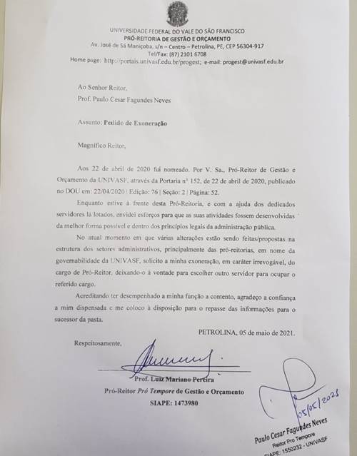 A situação político-administrativa da Universidade Federal do Vale do São Francisco (Univasf) parece continuar instável da cerca para dentro da instituição, a partir do processo de judicialização para a escolha do novo reitor e vice, que se arrasta desde o ano passado. O novo capítulo dessa novela foi o pedido de exoneração do Professor Luiz Mariano Pereira, pró-reitor pró-tempore de Gestão e Orçamento.