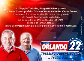 A coligação “Trabalho, Progresso e Paz” em Casa Nova (BA), que tem o atual prefeito Orlando Xavier (PR) como candidato à reeleição, realizará nesta sexta-feira (20) a inauguração do seu comitê central.