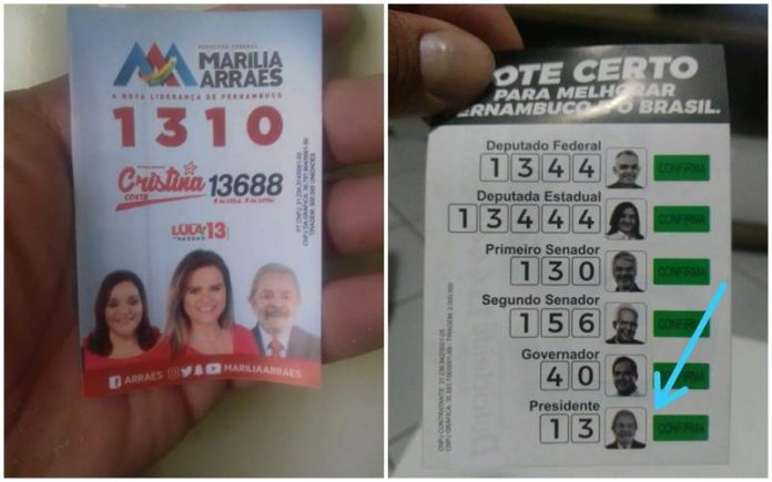 Estranhamente ‘santinhos’ dos candidatos do PT votados em Petrolina continuam aparecendo com o nome do ex-presidente Lula – e não de Fernando Haddad – como candidato a presidente pelas ruas da cidade.