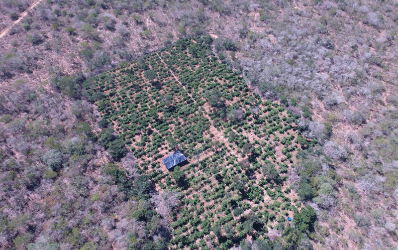 Uma denúncia anônima indicou o plantio ilegal no distrito de Bendegó, na zona rural. Após algumas horas sobrevoando a região, os PMs encontraram a plantação de maconha, uma quantidade relevante da erva já colhida e acampamentos usados pelos criminosos que davam manutenção no plantio.