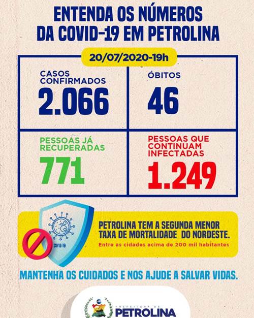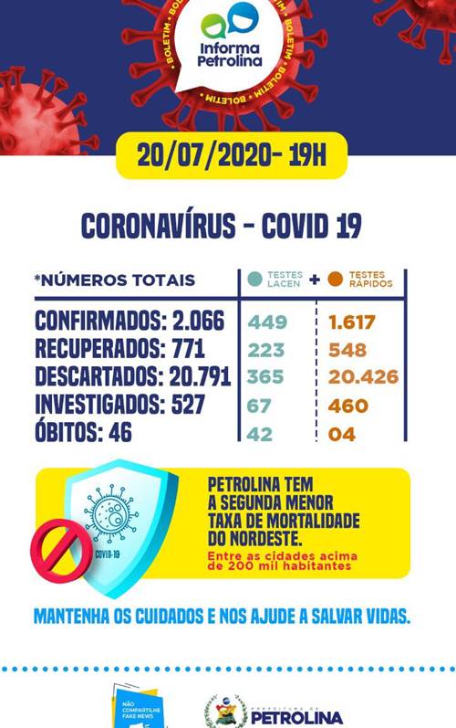 Petrolina tem mais três óbitos por Covid-19, mas todos ocorreram na semana passada e só foram confirmados nesta segunda-feira, com o recebimento dos respectivos exames analisados pelo Laboratório Central de Pernambuco (Lacen-PE). O primeiro é de uma criança de 10 meses de vida, que faleceu no dia 15. Um idoso de 80 anos que veio a óbito no mesmo dia também estava positivado. O terceiro registro é de um homem de 55 anos, que morreu no dia 17. Com isso, o total de óbitos subiu para 46.