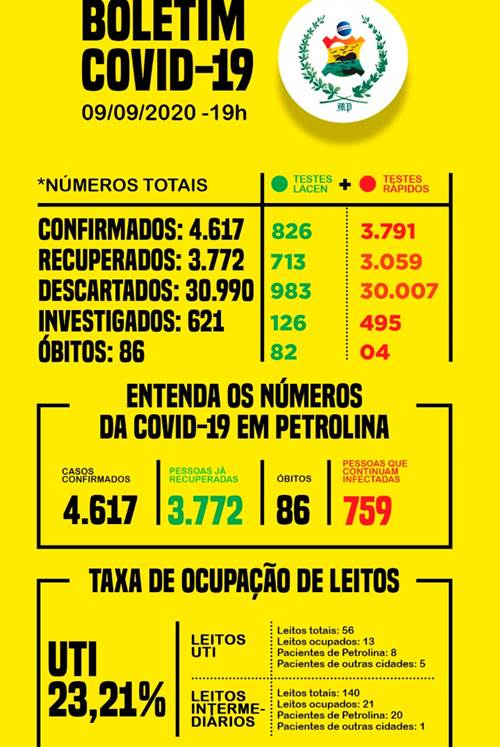 Do total de casos até o momento, 3.791 foram confirmados por testes rápidos da prefeitura e 826 diagnosticados através de exames laboratoriais. Petrolina tem 86 óbitos por Covid-19.