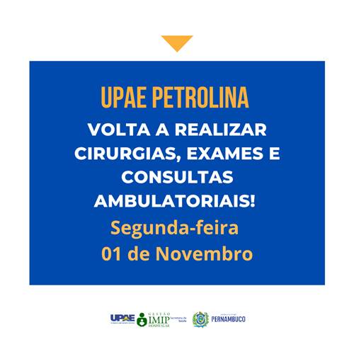 A Unidade de Pronto Atendimento e Atenção Especializada de Petrolina (UPAE/Imip) irá retomar as consultas ambulatoriais, exames e cirurgias na próxima segunda-feira (1º de novembro). Toda a população da 8ª Regional de Saúde – que inclui os municípios de Afrânio, Cabrobó, Dormentes, Lagoa Grande, Orocó, Petrolina e Santa Maria da Boa Vista – será beneficiada.