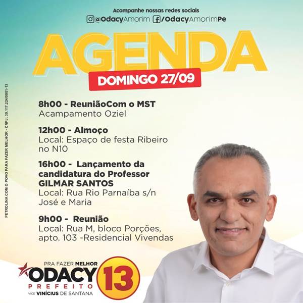 O candidato do PT, Odacy Amorim, também começou cedo sua agenda do primeiro dia de campanha com uma reunião com representantes do Movimento dos Sem Terra (MST) no Acampamento Oziel, às 8h. Em seguida, às 9h, foi ao Residencial Vivendas reunir-se com moradores.