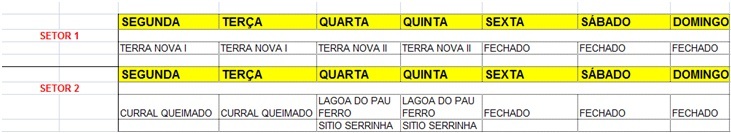 O setor 1 é formado pelas localidades de Terra Nova 1, que será abastecida nas segundas e terças-feiras; e Terra Nova 2, que terá água nas quartas e quintas-feiras.