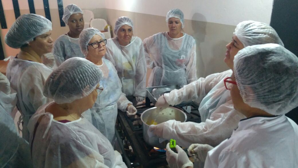 Na ocasião foi realizada uma dinâmica sobre boas práticas de fabricação para avaliar o nível de conhecimento do último encontro. Em seguida teve início a capacitação com a higienização das mãos e utensílios, a distribuição dos Equipamentos de Proteção Individual (EPIs) e a produção das receitas sugeridas pela comunidade – pasta de alho, almôndegas, tortilhão de abóbora e bode, lasanha de banana com bode e hambúrguer.