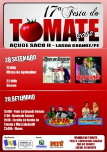 A comunidade de Açude Saco, zona rural de Lagoa Grande (PE), viverá neste fim de semana mais uma edição da Festa do Tomate. O evento começa nesta sexta-feira (28), às 17h, com a Missa do Agricultor. Logo depois, estão programados os shows com os cantores Frank do Acordeon e Nero Gomes.