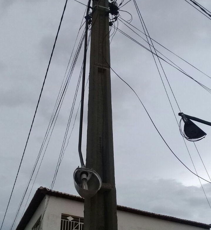 Moradores do bairro Kidé, em Juazeiro-Ba, apelam às autoridades para que seja consertado um poste de iluminação pública na Avenida Nazaré do bairro. O poste que tem causado apreensão na localidade, tem um braço quebrado e seguro apenas por um fio, um risco para quem mora ou passa por perto. O poste fica em frente a uma farmácia na via.