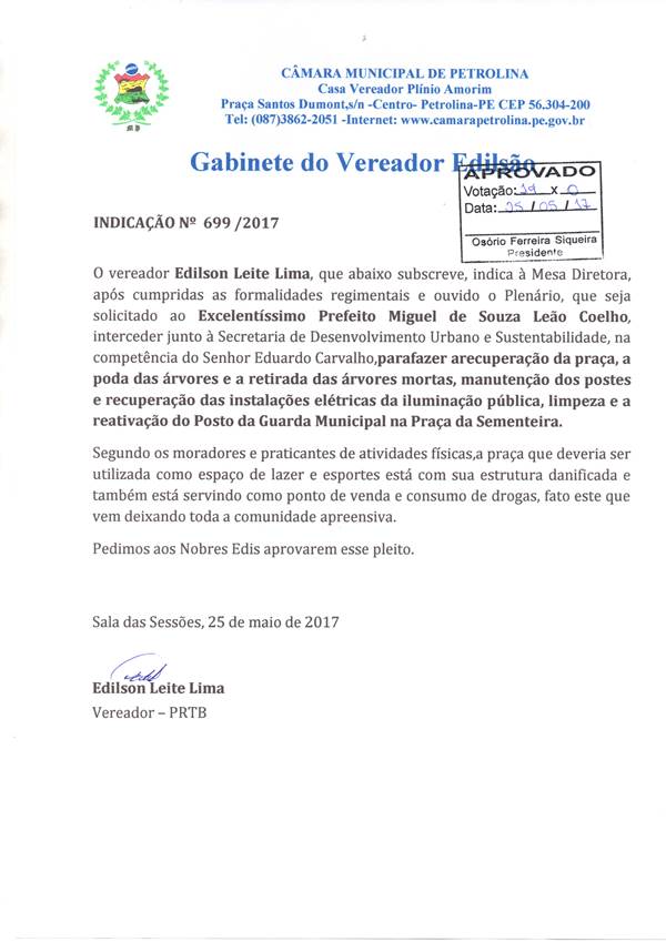 O cenário de abandono na antiga Praça da Sementeira, que tem sido alvo de críticas, também motivou o vereador Edilsão do Trânsito (PRTB) a cobrar da Prefeitura de Petrolina ações de melhorias para o local. Na sessão de ontem (25) na Casa Plínio Amorim, ele apresentou uma Indicação à Secretaria de Desenvolvimento Urbano e Sustentabilidade (Sedurbs), reivindicando a recuperação da estrutura da praça.