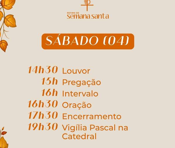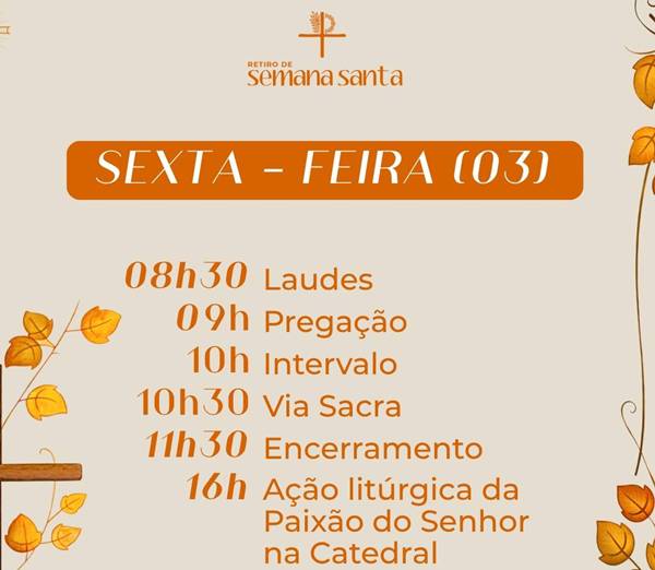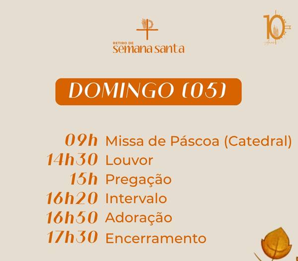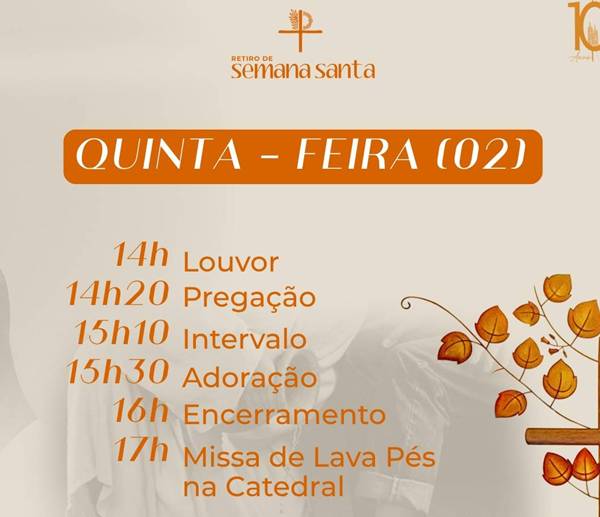 Vale destacar que a programação está em unidade com aquela divulgada pela Diocese de Petrolina. “Ou seja, existirão momentos em que estaremos, todos juntos, participando das missas, ações litúrgicas e vigília pascal nas igrejas católicas petrolinenses”, ressalta a comunidade Shalom. A programação completa pode ser conferida abaixo: